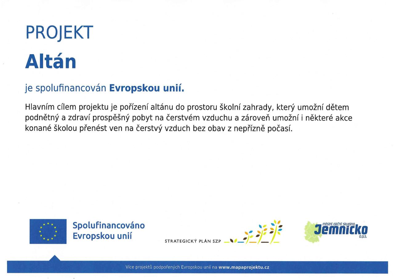 Hlavním cílem projektu je pořízení altánu do prostoru školní zahrady, který umožní dětem podnětný a zdraví prospěšný pobyt na čerstvém vzduchu.